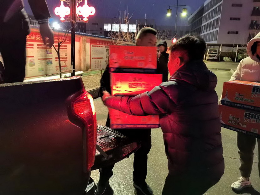 夜間,工會(huì)主席傅健一行現(xiàn)場(chǎng)看望慰問(wèn)清除冰雪戶外工作人員,為他們送上方便面等慰問(wèn)物資,并囑咐他們?cè)谛燎诠ぷ鞯耐瑫r(shí)做好防寒保暖、安全防護(hù)。為在冰天雪地中堅(jiān)持工作的一線工人送去了溫暖和關(guān)懷。