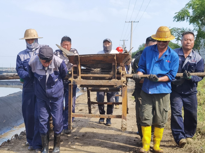 養(yǎng)殖池邊,工作人員仔細(xì)的對河道清淤進(jìn)行現(xiàn)場勘查,確保排水通暢。