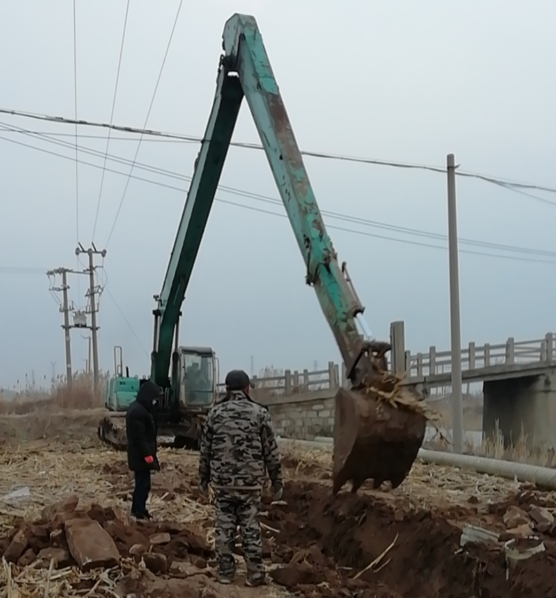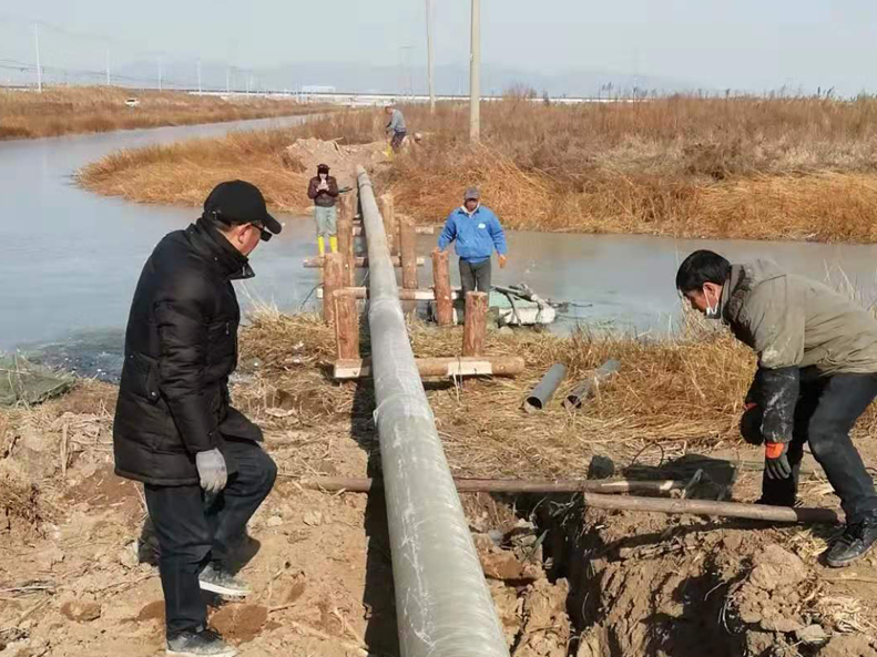 難!難!難!有困難才具有挑戰(zhàn),在“四拼”前一切困難皆為“紙老虎”,大家及時將壓力變?yōu)閯恿?。確定方案后,立即分頭行動,一切工作按部就班,購買8米木樁,河岸邊專人指揮長臂挖掘機機械打樁,頭頂高壓線與通信線路相互交織,現(xiàn)場安全員全過程監(jiān)督指揮保障施工安全距離緊張施工,利用簡易泡沫筏人工敲開河面冰層,劃到河心鉆孔安裝木橫擔,人工開挖河對岸管道,切割吊取管道,打磨涂覆,一切都在有條不紊的進行中。考慮到玻璃鋼管道的易碎性,不敢使用挖掘機吊裝,只能全人工小心翼翼的一小段一小段的輕抬慢放,慢慢挪到門型橫擔上緩緩過河,捆綁固定,最后是對口纏裹涂覆回填竣工。