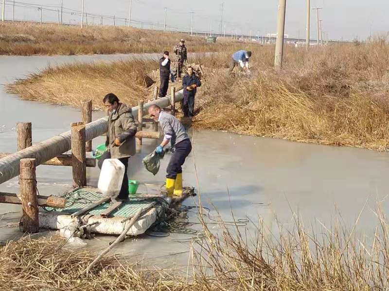 方案是拿出來了,但苛刻的現(xiàn)場環(huán)境、嚴峻的施工條件像冬季的陰霾再度籠罩在大家心頭!河對岸無交通橋梁人員無法直達對面,利用船只過河又面臨著河面結(jié)冰。以往這種距離的過河都是采用PE管(質(zhì)地柔軟彎曲性能優(yōu)越),但購買PE管道的成本太高。玻璃鋼管道本來就比較脆弱易碎,更何況是三節(jié)連接在一起長達36米的過河管道,這在鹽場管道施工史上還沒有先例。